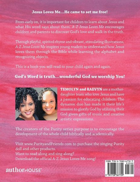 TEMOLYN and RAEVYN are a mother-daughter team who love Jesus and have a passion for educating children. The dynamic duo has made it their life's mission to glorify God by utilizing their God given gifts of music and creative artistic expressions. The creators of the Purity series purpose is to encourage the development of the whole child biblically and academically. Visit www.PurityandFriends.com to purchase the singing Purity doll and other products. Want to read along and sing along? Download the official A-Z Jesus Loves Me song!