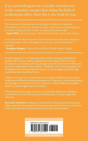 If you are looking for an accessible introduction to the essential concepts that define the field of professional ethics, then this is the book for you. Richard Hugman's A-Z of Professional Ethics offers a winning combination of breadth and concision, expertly organised to make usage intuitive and easy. Its simple A-Z structure will help you appreciate the architecture of ethics and give you a vocabulary for ethical debate. Clever cross-referencing allows you to find your own routes through the material as well as signposting interesting connections between different ideas. Unique to this book are its sensitivity to cross-cultural influences and its careful integration of different professional perspectives. These give it outstanding balance and coverage. A rich source of further references, it offers readers an invaluable guide to an increasingly extensive literature. Whatever your field of study or practice (social work, health care, or therapy), this book will prove an enduring source of clarity, insight and reflection.