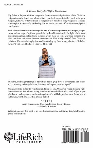 Embark on a transformative journey with Wenefer White in "A-Z: Come To Myself, A Shift in Consciousness," the second installment of her impactful book series. With this collection of stories, she unveils the powerful concept of "BETTER" (Begin Experiencing The Transforming Energy Remedy). This acronym is the key to unlocking one's inner strength and becoming one's authentic spiritual self. "Come To Myself," is an empowering concept that is all about finding and experiencing a deep shift in your consciousness, i.e., that perfect harmony between your body, mind, and spiritual self, and connecting with your emotions on a whole new level. Through the art of storytelling, this book will uplift your spirits, guide you toward authenticity, and embrace the incredible unshaken power that lives within you, i.e., evolving into our 'BETTER' selves.