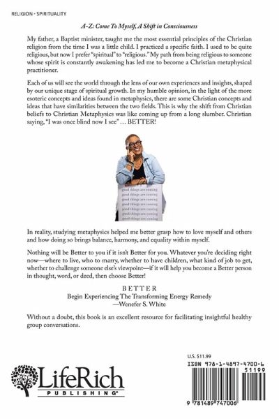 Embark on a transformative journey with Wenefer White in "A-Z: Come To Myself, A Shift in Consciousness," the second installment of her impactful book series. With this collection of stories, she unveils the powerful concept of "BETTER" (Begin Experiencing The Transforming Energy Remedy). This acronym is the key to unlocking one's inner strength and becoming one's authentic spiritual self. "Come To Myself," is an empowering concept that is all about finding and experiencing a deep shift in your consciousness, i.e., that perfect harmony between your body, mind, and spiritual self, and connecting with your emotions on a whole new level. Through the art of storytelling, this book will uplift your spirits, guide you toward authenticity, and embrace the incredible unshaken power that lives within you, i.e., evolving into our 'BETTER' selves.