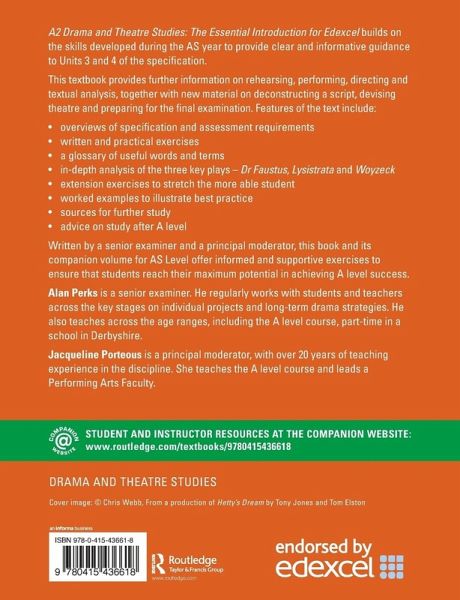 A2 Drama and Theatre Studies: The Essential Introduction for Edexcel builds on the skills developed during the AS year to provide clear and informative guidance to Units 3 and 4 of the specification. The textbook provides further information on rehearsing, performing, directing and textual analysis, together with new material on deconstructing a script, devising theatre and preparing for the final examination. Features of the text include: overviews of specification and assessment requirements written and practical exercises a glossary of useful words and terms in-depth analysis of the three key plays - Dr Faustus, Lysistrata and Woyzeck extension exercises to stretch the more able student worked examples to illustrate best practice sources for further study advice on study after A Level. Written by a chief examiner and a principal moderator, this book and its companion volume for AS Level offer informed and supportive exercises to ensure that students reach their maximum potential in achieving A Level success.