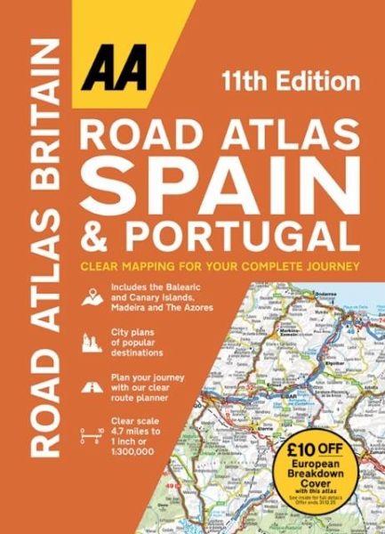 Road atlas covering Spain and Portugal, including 50 city street plans and 10 large scale approach maps. Features include distance chart and travel information, map legends and page title in 12 European languages and GBP10 off European Breakdown cover offer.