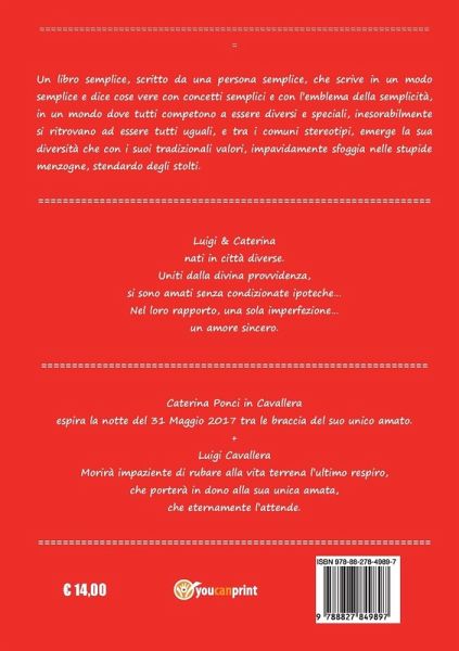 Un libro semplice, scritto da una persona semplice, che scrive in un modo semplice e dice cose vere con concetti semplici e con l'emblema della semplicità, in un mondo dove tutti competono a essere diversi e speciali, inesorabilmente si ritrovano ad essere tutti uguali, e tra i comuni stereotipi, emerge la sua diversità che con i suoi tradizionali valori, impavidamente sfoggia nelle stupide menzogne, stendardo degli stolti.