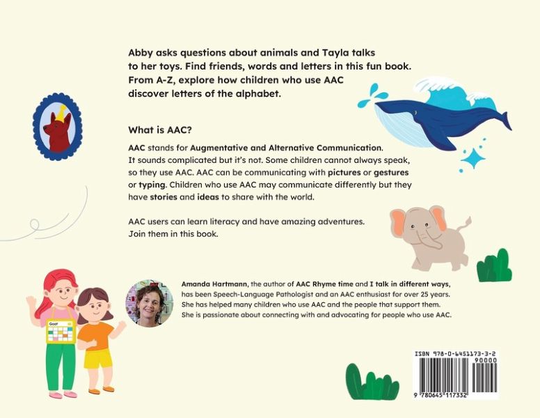 Abby asks questions about animals and Tayla talks to her toys. Find friends, words and letters in this fun book. From A-Z, explore how children who use AAC, discover letters of the alphabet. AAC stands for Augmentative and Alternative Communication. It sounds complicated but it's not. Some children cannot always speak, so they use AAC. AAC can be communicating with pictures or gestures or typing. Children who use AAC may communicate differently but they have stories and ideas to share with the world. AAC users can learn literacy and have amazing adventures. Join them in this book.