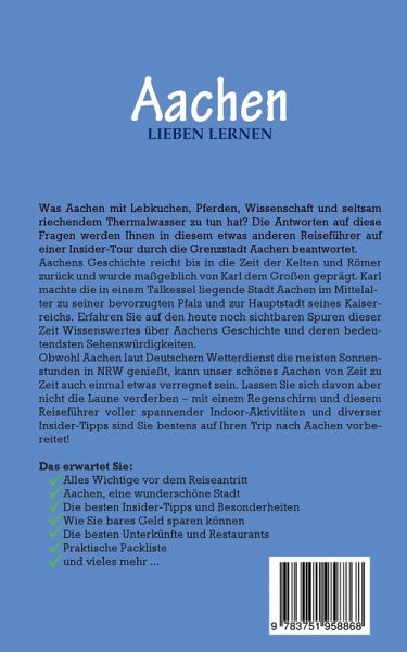 Was Aachen mit Lebkuchen, Pferden, Wissenschaft und seltsam riechendem Thermalwasser zu tun hat? Die Antworten auf diese Fragen werden Ihnen in diesem etwas anderen Reiseführer auf einer Insider-Tour durch die Grenzstadt Aachen beantwortet. Aachens Geschichte reicht bis in die Zeit der Kelten und Römer zurück und wurde maßgeblich von Karl dem Großen geprägt. Karl machte die in einem Talkessel liegende Stadt Aachen im Mittelalter zu seiner bevorzugten Pfalz und zur Hauptstadt seines Kaiserreichs. Erfahren Sie auf den heute noch sichtbaren Spuren dieser Zeit Wissenswertes über Aachens Geschichte und deren bedeutendsten Sehenswürdigkeiten.Obwohl Aachen laut Deutschem Wetterdienst die meisten Sonnenstunden in NRW genießt, kann unser schönes Aachen von Zeit zu Zeit auch einmal etwas verregnet sein. Lassen Sie sich davon aber nicht die Laune verderben - mit einem Regenschirm und diesem Reiseführer voller spannender Indoor-Aktivitäten und diverser Insider-Tipps sind Sie bestens auf Ihren Trip nach Aachen vorbereitet!Das erwartet Sie:-Alles Wichtige vor dem Reiseantritt-Aachen, eine wunderschöne Stadt-Die besten Insider-Tipps und Besonderheiten-Wie Sie bares Geld sparen können-Die besten Unterkünfte und Restaurants-Praktische Packliste-und vieles mehr ...
