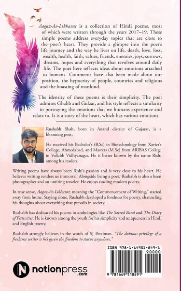 Aagaz-Ae-Likhavat is a collection of Hindi poems, most of which were written through the years 2017-19. These simple poems address everyday topics that are close to the poet's heart. They provide a glimpse into the poet's life journey and the way he lives on life, death, love, loss, wealth, health, faith, values, friends, enemies, joys, sorrows, dreams, hopes and everything that revolves around daily life . The poet here reflects ideas about emotions attached to humans. Comments have also been made about our position, the hypocrisy of people, countries and religions and the boasting of mankind. The identity of these poems is their simplicity. The poet admires Ghalib and Gulzar, and his style reflects a similarity in portraying the emotions that we humans experience and relate to. It is a story of the heart, which has various emotions.