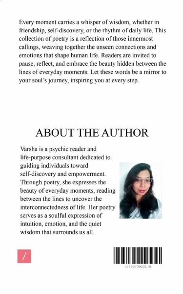 Every moment carries a whisper of wisdom, whether in friendship, self-discovery, or the rhythm of daily life. This collection of poetry is a reflection of those innermost callings, weaving together the unseen connections and emotions that shape human life. Readers are invited to pause, reflect, and embrace the beauty hidden between the lines of everyday moments. Let these words be a mirror to your soul's journey, inspiring you at every step.
