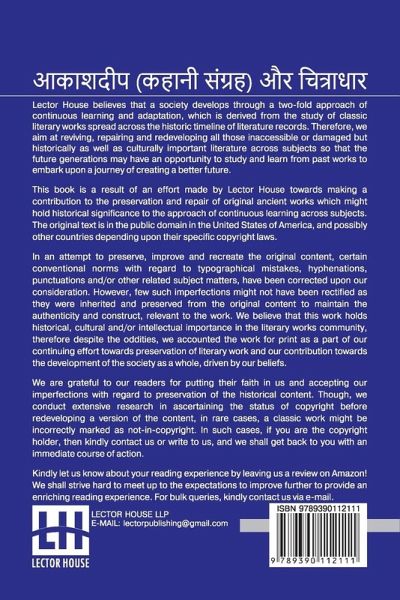 Aakashdeep (Kahani Sangraha) Aur Chitradhar This book is a result of an effort made by us towards making a contribution to the preservation and repair of original classic literature. In an attempt to preserve, improve and recreate the original content, we have worked towards: 1. Type-setting & Reformatting: The complete work has been re-designed via professional layout, formatting and type-setting tools to re-create the same edition with rich typography, graphics, high quality images, and table elements, giving our readers the feel of holding a 'fresh and newly' reprinted and/or revised edition, as opposed to other scanned & printed (Optical Character Recognition - OCR) reproductions. 2. Correction of imperfections: As the work was re-created from the scratch, therefore, it was vetted to rectify certain conventional norms with regard to typographical mistakes, hyphenations, punctuations, blurred images, missing content/pages, and/or other related subject matters, upon our consideration. Every attempt was made to rectify the imperfections related to omitted constructs in the original edition via other references. However, a few of such imperfections which could not be rectified due to intentional\unintentional omission of content in the original edition, were inherited and preserved from the original work to maintain the authenticity and construct, relevant to the work. We believe that this work holds historical, cultural and/or intellectual importance in the literary works community, therefore despite the oddities, we accounted the work for print as a part of our continuing effort towards preservation of literary work and our contribution towards the development of the society as a whole, driven by our beliefs. We are grateful to our readers for putting their faith in us and accepting our imperfections with regard to preservation of the historical content. HAPPY READING!