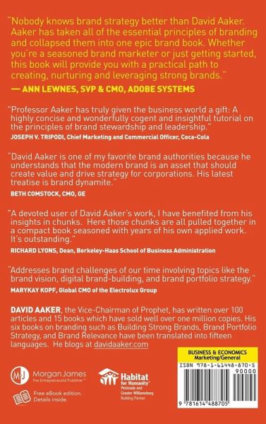 Aaker on Branding provides the principles of branding you need to know to create and manage strong brands. The concepts are culled from the articles, six branding books, and other writings of David Aaker and have been proven to help hundreds of firms develop branding programs. With five sections, it provides a story arc about creating a strong brand that involves understanding that brands are assets, creating a compelling brand vision, bringing the brand to life in the marketplace, maintaining its relevance over time, and managing the brand team to create clarity, synergy, and leverage. The book provides a vehicle for a marketing professional to learn or review the issues, problems, and solutions of branding in a compact form.