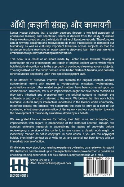 Aandhi (Kahani Sangraha) Aur Kamayani This book is a result of an effort made by us towards making a contribution to the preservation and repair of original classic literature. In an attempt to preserve, improve and recreate the original content, we have worked towards: 1. Type-setting & Reformatting: The complete work has been re-designed via professional layout, formatting and type-setting tools to re-create the same edition with rich typography, graphics, high quality images, and table elements, giving our readers the feel of holding a 'fresh and newly' reprinted and/or revised edition, as opposed to other scanned & printed (Optical Character Recognition - OCR) reproductions. 2. Correction of imperfections: As the work was re-created from the scratch, therefore, it was vetted to rectify certain conventional norms with regard to typographical mistakes, hyphenations, punctuations, blurred images, missing content/pages, and/or other related subject matters, upon our consideration. Every attempt was made to rectify the imperfections related to omitted constructs in the original edition via other references. However, a few of such imperfections which could not be rectified due to intentional\unintentional omission of content in the original edition, were inherited and preserved from the original work to maintain the authenticity and construct, relevant to the work. We believe that this work holds historical, cultural and/or intellectual importance in the literary works community, therefore despite the oddities, we accounted the work for print as a part of our continuing effort towards preservation of literary work and our contribution towards the development of the society as a whole, driven by our beliefs. We are grateful to our readers for putting their faith in us and accepting our imperfections with regard to preservation of the historical content. HAPPY READING!