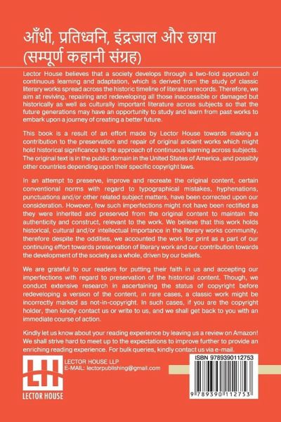 Aandhi, Pratidhwani, Indrajaal Aur Chaaya (Sampoorna Kahani Sangraha): Aandhi (Kahani Sangraha), Pratidhwani (Kahani Sangraha), Indrajaal (Kahani Sangraha), Chaaya (Kahani Sangraha) This book is a result of an effort made by us towards making a contribution to the preservation and repair of original classic literature. In an attempt to preserve, improve and recreate the original content, we have worked towards: 1. Type-setting & Reformatting: The complete work has been re-designed via professional layout, formatting and type-setting tools to re-create the same edition with rich typography, graphics, high quality images, and table elements, giving our readers the feel of holding a 'fresh and newly' reprinted and/or revised edition, as opposed to other scanned & printed (Optical Character Recognition - OCR) reproductions. 2. Correction of imperfections: As the work was re-created from the scratch, therefore, it was vetted to rectify certain conventional norms with regard to typographical mistakes, hyphenations, punctuations, blurred images, missing content/pages, and/or other related subject matters, upon our consideration. Every attempt was made to rectify the imperfections related to omitted constructs in the original edition via other references. However, a few of such imperfections which could not be rectified due to intentional\unintentional omission of content in the original edition, were inherited and preserved from the original work to maintain the authenticity and construct, relevant to the work. We believe that this work holds historical, cultural and/or intellectual importance in the literary works community, therefore despite the oddities, we accounted the work for print as a part of our continuing effort towards preservation of literary work and our contribution towards the development of the society as a whole, driven by our beliefs. We are grateful to our readers for putting their faith in us and accepting our imperfections with regard to preservation of the historical content. HAPPY READING!