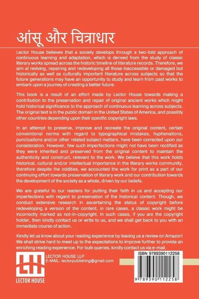 Aansu Aur Chitradhar This book is a result of an effort made by us towards making a contribution to the preservation and repair of original classic literature. In an attempt to preserve, improve and recreate the original content, we have worked towards: 1. Type-setting & Reformatting: The complete work has been re-designed via professional layout, formatting and type-setting tools to re-create the same edition with rich typography, graphics, high quality images, and table elements, giving our readers the feel of holding a 'fresh and newly' reprinted and/or revised edition, as opposed to other scanned & printed (Optical Character Recognition - OCR) reproductions. 2. Correction of imperfections: As the work was re-created from the scratch, therefore, it was vetted to rectify certain conventional norms with regard to typographical mistakes, hyphenations, punctuations, blurred images, missing content/pages, and/or other related subject matters, upon our consideration. Every attempt was made to rectify the imperfections related to omitted constructs in the original edition via other references. However, a few of such imperfections which could not be rectified due to intentional\unintentional omission of content in the original edition, were inherited and preserved from the original work to maintain the authenticity and construct, relevant to the work. We believe that this work holds historical, cultural and/or intellectual importance in the literary works community, therefore despite the oddities, we accounted the work for print as a part of our continuing effort towards preservation of literary work and our contribution towards the development of the society as a whole, driven by our beliefs. We are grateful to our readers for putting their faith in us and accepting our imperfections with regard to preservation of the historical content. HAPPY READING!