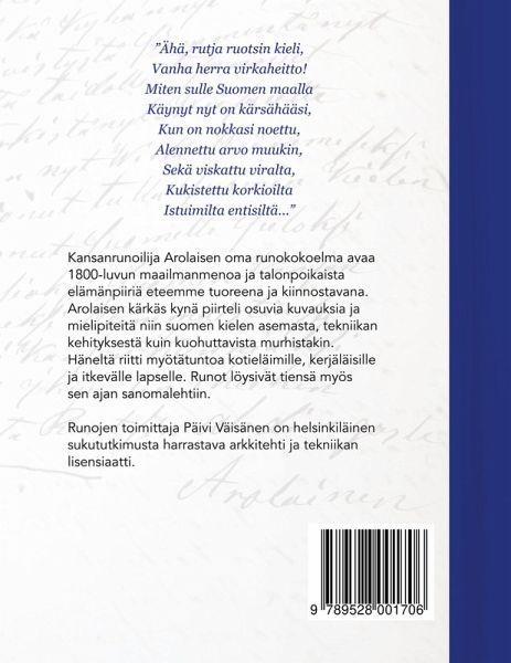 Ähä, rutja ruotsin kieli, Vanha herra virkaheitto! Miten sulle Suomen maalla Käynyt nyt on kärsähääsi, Kun on nokkasi noettu, Alennettu arvo muukin, Sekä viskattu viralta, Kukistettu korkioilta Istuimilta entisiltä... Kansanrunoilija Arolaisen oma runokokoelma avaa 1800-luvun maailmanmenoa ja talonpoikaista elämänpiiriä eteemme tuoreena ja kiinnostavana. Arolaisen kärkäs kynä piirteli osuvia kuvauksia ja mielipiteitä niin suomen kielen asemasta, tekniikan kehityksestä kuin kuohuttavista murhistakin. Häneltä riitti myötätuntoa kotieläimille, kerjäläisille ja itkevälle lapselle. Runot löysivät tiensä myös sen ajan sanomalehtiin.