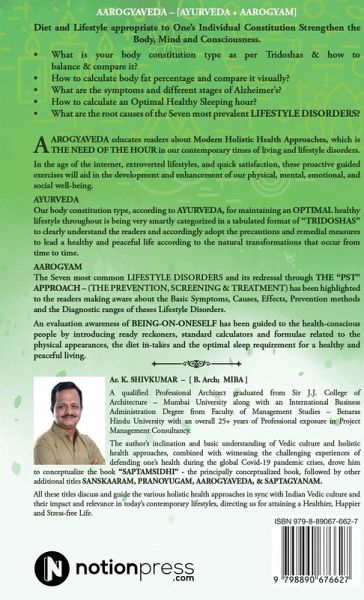 AAROGYAVEDA educates readers about Modern Holistic Health Approaches, which is THE NEED OF THE HOUR in our contemporary times of living and lifestyle disorders. In the age of the internet, extroverted lifestyles, and quick satisfaction, these proactive guided exercises will aid in the development and enhancement of our physical, mental, emotional, and social well-being. AYURVEDA Our body constitution type, according to AYURVEDA, for maintaining an OPTIMAL healthy lifestyle throughout is being very smartly categorized in a tabulated format of "TRIDOSHAS" to clearly understand the readers and accordingly adopt the precautions and remedial measures to lead a healthy and peaceful life according to the natural transformations that occur from time to time. AAROGYAM The Seven most common LIFESTYLE DISORDERS and its redressal through THE 'PST' APPROACH - (THE PREVENTION, SCREENING & TREATMENT) has been highlighted to the readers making aware about the Basic Symptoms, Causes, Effects, Prevention methods and the Diagnostic ranges of theses Lifestyle Disorders. An evaluation awareness of BEING-ON-ONESELF has been guided to the health-conscious people by introducing ready reckoners, standard calculators and formulae related to the physical appearances, the diet in-takes and the optimal sleep requirement for a healthy and peaceful living.