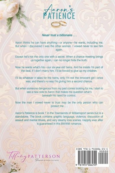 Never trust a billionaire . . . Aaron thinks he can have anything-or anyone-he wants, including me. But when I discovered I was the other woman, I vowed never to see him again. Except he's not the only one with a secret. When a chance meeting brings us together again, I can no longer hide the truth. Now he wants what's his-our six-year-old twins. And he insists I'm part of the deal. If I don't marry him, I'll be forced to give up my children. I'll do whatever it takes for the twins, only I'm not the innocent girl I once was, and there's no way I'm giving him a second chance. But when someone dangerous from my past comes looking for me, I start to see a new side to Aaron that makes me question what's beneath his need for control. Now the man I vowed never to trust may be the only person who can protect me . . . Aaron's Patience is book 1 in the Townsends of Williamsport series but is a standalone. The book contains graphic language, violence, discussion of assault and mental illness, and very steamy love scenes. Happily ever after is guaranteed in this BWWM romance. Never trust a billionaire . . . Aaron thinks he can have anything-or anyone-he wants, including me. But when I discovered I was the other woman, I vowed never to see him again. Except he's not the only one with a secret. When a chance meeting brings us together again, I can no longer hide the truth. Now he wants what's his-our six-year-old twins. And he insists I'm part of the deal. If I don't marry him, I'll be forced to give up my children. I'll do whatever it takes for the twins, only I'm not the innocent girl I once was, and there's no way I'm giving him a second chance. But when someone dangerous from my past comes looking for me, I start to see a new side to Aaron that makes me question what's beneath his need for control. Now the man I vowed never to trust may be the only person who can protect me . . . Aaron's Patience is book 1 in the Townsends of Williamsport series but is a standalone. The book contains graphic language, violence, discussion of assault and mental illness, and very steamy love scenes. Happily ever after is guaranteed in this BWWM romance.