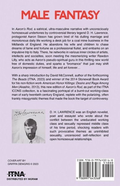 In Aaron's Rod, a satirical, ultra-masculine narrative with unconsciously homosexual undertones by controversial literary legend D.H. Lawrence, protagonist Aaron Sisson has grown tired of his dulling marriage and monotonous daily life working a desk job for a coal mine business in the Midlands of England. He abandons his wife and children to chase dreams of fame and fortune as a professional flutist, and embarks on an impulsive trip to Italy. There, he networks in various inner circles of artists, intellects and socialites, soon meeting the mesmerizing writer Rawdon Lilly, who acts as Aaron's pseudo-spiritual guru in this thrilling new world free of domestic duties, and sparks a "bromance" that just may shift Aaron's impression of himself, life and art forever... With a sharp introduction by David McConnell, author of the forthcoming The Beads (ITNA, 2023) and winner of the 2014 Stonewall Book Award for his non-fiction work American Honor Killings: Desire and Rage Among Men (Akashic, 2013), this new edition of Aaron's Rod, as part of the ITNA ICONS collection, is a fascinating portrayal of a burnt-out working-class man of early twentieth century England, replete with the polarizing, often frankly misogynistic themes that made the book the target of controversy.