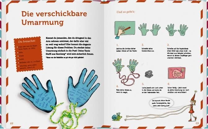 viel mehr. Das ganze ist in eine Comicgeschichte eingebunden. Der Briefträger Ricky Schnick freut…mehrHeute möchte ich euch ein Kreativbuch vorstellen, dass mich absolut begeistert hat. Wie der Titel "Ab die Post!" schon erahnen lässt, dreht sich alles um die Post. Das Besondere ist, dass hier nicht einfach nur einzelne DIY-Ideen mit Anleitung aneindergereiht aufgeführt werden. Nein, dieses Buch ist viel mehr. Das ganze ist in eine Comicgeschichte eingebunden. Der Briefträger Ricky Schnick freut sich, wenn er bei Fantasilie Post abgeben kann, denn die Briefe, die sie bekommt, sind immer ganz besonders schön. Die beiden kommen ins Gespräch, wieso Fantasilie immer so tolle Briefe bekommt und so wird Ricky Schnick auf einen Ausflug eingeladen, mit Fantasilie zusammen einige ihrer Freunde zu besuchen. Und so ergibt sich eine Gliederung des Buchs. Immer wieder besuchen wir neue Freunde und bekommen dort deren Spezialgebiet vorgestellt. Was ich besonders schön finde, ist die direkte Ansprache des Lesers. Das schafft Nähe, wirkt persönlich und man fühlt sich wohl und angesprochen.