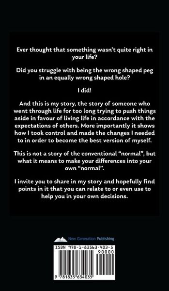 Ever thought that something wasn't quite right in your life? Did you struggle with being the wrong shaped peg in an equally wrong shaped hole? I did! And this is my story, the story of someone who went through life for too long trying to push things aside in favour of living life in accordance with the expectations of others. More importantly it shows how I took control and made the changes I needed to in order to become the best version of myself. This is not a story of the conventional "normal", but what it means to make your differences into your own "normal". I invite you to share in my story and hopefully find points in it that you can relate to or even use to help you in your own decisions.