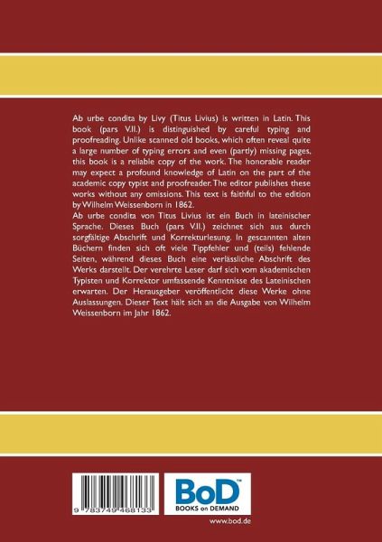 Ab urbe condita by Livy (Titus Livius) is written in Latin. This book (pars V.II.) is distinguished by careful typing and proofreading. Unlike scanned old books, which often reveal quite a large number of typing errors and even (partly) missing pages, this book is a reliable copy of the work. The honorable reader may expect a profound knowledge of Latin on the part of the academic copy typist and proofreader. The editor publishes these works without any omissions. This text is faithful to the edition by Wilhelm Weissenborn in 1862.