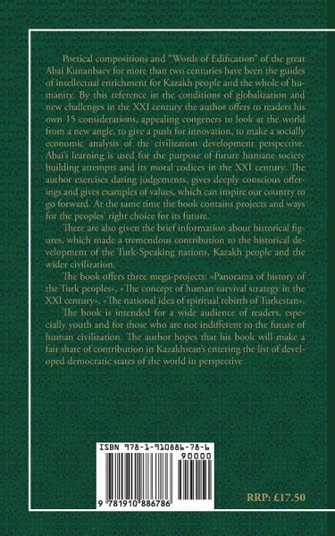 Poetical compositions and "Words of Edification" of the great Abai Kunanbaev for more than two centuries have been the guides of intellectual enrichment for Kazakh people and the whole of humanity. By this reference in the conditions of globalization and new challenges in the XXI century the author offers to readers his own 15 considerations, appealing congeners to look at the world from a new angle, to give a push for innovation, to make a socially economic analysis of the civilization development perspective. Abai’s learning is used for the purpose of future humane society building attempts and its moral codices in the XXI century. The author exercises daring judgements, gives deeply conscious offerings and gives examples of values, which can inspire our country to go forward. At the same time the book contains projects and ways for the peoples’ right choice for its future. There are also given the brief information about historical figures, which made a tremendous contribution to the historical development of the Turk-Speaking nations, Kazakh people and the wider civilization. The book offers three mega-projects: «Panorama of history of the Turk peoples», «The concept of human survival strategy in the XXI century», «The national idea of spiritual rebirth of Turkestan». The book is intended for a wide audience of readers, espe-cially youth and for those who are not indifferent to the future of human civilization. The author hopes that his book will make a fair share of contribution in Kazakhstan’s entering the list of developed democratic states of the world in perspective
