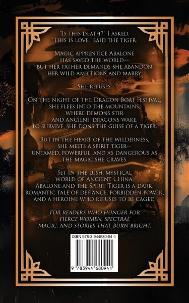 "Is this death?" I asked. "This is love," replied the tiger. Magic apprentice Abalone has just saved the world from the wrath of underwater dragons. But her triumph is short-lived-her father, the great alchemist, demands she marry, expecting her to resign herself to a life of embroidered robes, quiet obedience, and managing household affairs. Abalone, however, has far wilder ambitions. Her heart burns to master fire magic, unravel forbidden rituals, and pursue the ancient mysteries that ignite her very soul. So, on the night of the legendary Dragon Boat Festival, she escapes into the mountains under the cover of darkness. It is a time when dark demons and ancient dragons stir from their deep slumber. To protect herself from the creatures that haunt the night, Abalone dons the guise of a tiger. But deep within the mountains, beneath the shadowed sky, she meets the burning gaze of a spirit tiger-a being whose heart is as untamed and enigmatic as the magic she seeks. Romantic, dark, and steeped in ancient mystery. Abalone and the Spirit Tiger is a tale that refuses to be tamed. Set against the lush backdrop of Ancient China, it follows a heroine who defies the forces that seek to silence her. Magic, mystery, and forbidden power pulse through every page as Abalone carves a path that only she can walk. For those who hunger for stories of fierce, unyielding women, this novel offers a journey rich with beauty and intrigue. With spectral magic and a quirky, strong-willed heroine who answers to no one but herself, Abalone and the Spirit Tiger is a bold, haunting exploration of love, courage, and transformation.