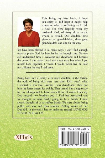 Being born into a family with seven children in the forties, the odds of being rich were very slim. Rich wasn't what I wanted, it was love. Instead, I was abandoned. Then put into the foster system for awhile. That turned into a nightmare for my siblings and I. Love was still out of reach. Then my Dad rescued two brothers and I. Dad had remarried and we thought we were fi nally going to be a family. I have always thought of us as rubber bands. We were always being pulled one way and then another. Pulling wasn't all our Dad did. In the end, I had to make my escape!! LOVE WAS NEVER IN REACH!!!