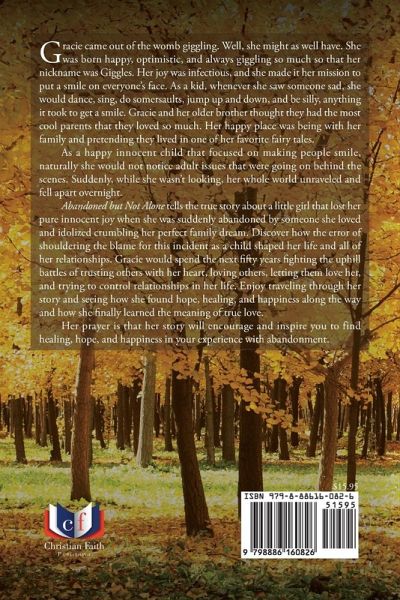Gracie came out of the womb giggling. Well, she might as well have. She was born happy, optimistic, and always giggling so much so that her nickname was Giggles. Her joy was infectious, and she made it her mission to put a smile on everyone's face. As a kid, whenever she saw someone sad, she would dance, sing, do somersaults, jump up and down, and be silly, anything it took to get a smile. Gracie and her older brother thought they had the most cool parents that they loved so much. Her happy place was being with her family and pretending they lived in one of her favorite fairy tales. As a happy innocent child that focused on making people smile, naturally she would not notice adult issues that were going on behind the scenes. Suddenly, while she wasn't looking, her whole world unraveled and fell apart overnight. "Abandoned but Not Alone" tells the true story about a little girl that lost her pure innocent joy when she was suddenly abandoned by someone she loved and idolized crumbling her perfect family dream. Discover how the error of shouldering the blame for this incident as a child shaped her life and all of her relationships. Gracie would spend the next fifty years fighting the uphill battles of trusting others with her heart, loving others, letting them love her, and trying to control relationships in her life. Enjoy traveling through her story and seeing how she found hope, healing, and happiness along the way and how she finally learned the meaning of true love. Her prayer is that her story will encourage and inspire you to find healing, hope, and happiness in your experience with abandonment.