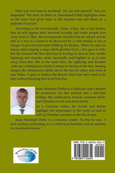 Have you lost hope in anything? Do you feel rejected? Are you desperate? The story of Nimo in Abandoned Child highlights some of the ways God gives hope to the hopeless and sets them on a pedestal of success. According to his townspeople, Nimo, a boy, has a bad destiny that he will oppose their ancestral worship and make people turn away from it. Thus, the townspeople consider him an outcast and tie him to a tree in a forest to be devoured by a wild animal or die of hunger to prevent him from fulfilling his destiny. While he cries for rescue amid singing a song which glorifies God, a lion goes to him. But the moment the lion stretches its forelegs to devour him, terrific lightning and thunder strike repeatedly and frighten it, so it runs away from him. But at the same time, the lightning and thunder wake up a chimpanzee which is asleep on the top of the tree. Sensing danger, the chimpanzee climbs down the tree for safety and when it sees Nimo, it goes to destroy the thread which has been used to tie him without harming him to set him free.