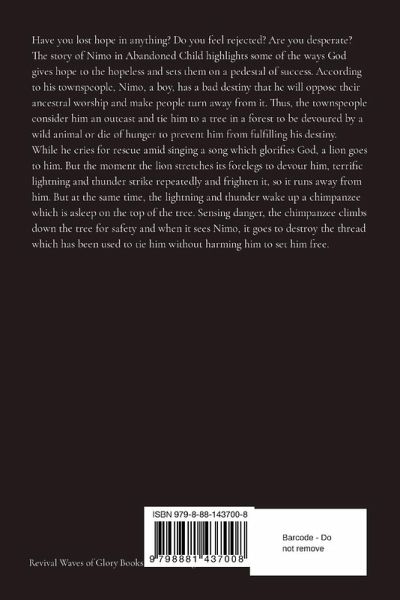 Have you lost hope in anything? Do you feel rejected? Are you desperate? The story of Nimo in Abandoned Child highlights some of the ways God gives hope to the hopeless and sets them on a pedestal of success. According to his townspeople, Nimo, a boy, has a bad destiny that he will oppose their ancestral worship and make people turn away from it. Thus, the townspeople consider him an outcast and tie him to a tree in a forest to be devoured by a wild animal or die of hunger to prevent him from fulfilling his destiny. While he cries for rescue amid singing a song which glorifies God, a lion goes to him. But the moment the lion stretches its forelegs to devour him, terrific lightning and thunder strike repeatedly and frighten it, so it runs away from him. But at the same time, the lightning and thunder wake up a chimpanzee which is asleep on the top of the tree. Sensing danger, the chimpanzee climbs down the tree for safety and when it sees Nimo, it goes to destroy the thread which has been used to tie him without harming him to set him free.