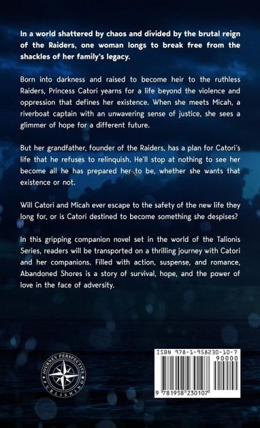 In a world shattered by chaos and divided by the brutal reign of the Raiders, one woman longs to break free from the shackles of her family's legacy. Born into darkness and raised to become heir to the ruthless Raiders, Princess Catori yearns for a life beyond the violence and oppression that defines her existence. When she meets Micah, a riverboat captain with an unwavering sense of justice, she sees a glimmer of hope for a different future. But her grandfather, founder of the Raiders, has a plan for Catori's life that he refuses to relinquish. He'll stop at nothing to see her become all he has prepared her to be, whether she wants that existence or not. Will Catori and Micah ever escape to the safety of the new life they long for, or is Catori destined to become something she despises? In this gripping companion novel set in the world of the Talionis Series, readers will be transported on a thrilling journey with Catori and her companions. Filled with action, suspense, and romance, Abandoned Shores is a story of survival, hope, and the power of love in the face of adversity. Fans of dystopian fiction and epic romances will be captivated by this heart-pounding tale of adventure, danger, and the unbreakable bond between two unlikely allies.