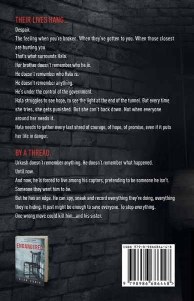 THEIR LIVES HANG... Despair. The feeling when you're broken. When they've gotten to you. When those closest are hurting you. That's what surrounds Hala. Her brother doesn't remember who he is. He doesn't remember who Hala is. He doesn't remember anything. He's under the control of the government. Hala struggles to see hope, to see the light at the end of the tunnel. But every time she tries, she gets punished. But she can't back down. Not when everyone around her needs it. Hala needs to gather every last shred of courage, of hope, of promise, even if it puts her life in danger. BY A THREAD. Urkesh doesn't remember anything. He doesn't remember what happened. Until now. And now, he is forced to live among his captors, pretending to be someone he isn't. Someone they want him to be. But he has an edge. He can spy, sneak and record everything they're doing, everything they're hiding. It just might be enough to save everyone. To stop everything. One wrong move could kill him...and his sister.