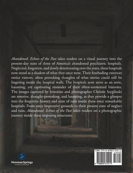 Abandoned: Echoes of the Past takes readers on a visual journey into the present-day state of three of America's abandoned psychiatric hospitals. Neglected, forgotten, and slowly deteriorating over the years, these hospitals now stand as a shadow of what they once were. Their foreboding exteriors entice visitors, often provoking thoughts of what stories could still be lingering inside the hospital walls. The hospitals now serve as an eerie, haunting, yet captivating reminder of their often-tormented histories. The images captured by historian and photographer Christie Seyglinski are emotive, thought-provoking, and haunting, as they provide a glimpse into the forgotten history and state of ruin inside these once remarkable hospitals. From once-impressive grounds to their present state of neglect and ruin, Abandoned: Echoes of the Past takes readers on a photographic journey inside these imposing structures.