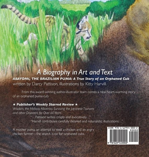 NSTA Outstanding Science Trade Book 2015How Wild Animals Survive Urban Environments The struggle for wild animals to live in urban areas plays out tragically in this children's animal book. How do wild animals survive in the middle of the city? In the far south, a puma family lived near skyscrapers, an urban environment. When the mother puma tries to steal a chicken to feed her cubs, an angry farmer captures her, and she dies. Now, the search if on for her orphaned cubs. Will the scientists be able to find the cubs before their time runs out? Woven into the story is the developing science of creating wildlife corridors to manage human and wild animal encounters. Scientists are studying how to connect wild areas to allow for animals to travel and to connect with others of their species. This heartwarming children's animal book explains the dangers of trying to trap wild animals. Read to learn how the orphaned cub survives. In this "Biography in Text and Art," Harvill took original photos as references to create accurate wildlife illustrations. These aren't generic cats, but one particular individual in detail. Pattison's careful research, vetted by scientists in the field, brings to life this this true story of an infant cub that must face a complicated world alone-and find a way to survive. ANOTHER EXTRAORDINARY ANIMAL SERIES Bird. Mammal. Marine Mammal. Spider. Amphibian. Reptile. Mollusk. This series includes the story of the oldest bird in the world, a spider in space, an orphaned puma cub, a bullfrog with a world-record leap, the poignant story of saving a species from extinction, and the dolphin who inspired a government to protect him. The series is much more than just an introduction to the animal kingdom. It chronicles the story of how humans interact with animals in various ways: how we enjoy, challenge, admire, endanger, and save them. It's a fabulous series for kids to learn about the amazing complexity of animals. Wisdom, the Midway Albatross: Surviving the Japanese Tsunami and Other Disasters for Over 60 Years, Starred Publisher's Weekly review Abayomi, the Brazilian Puma: The True Story of an Orphaned Cub, 2015 NSTA Outstanding Science Trade Book Nefertiti, the Spidernaut: The Jumping Spider Who Learned to Hunt in Space, 2017 NSTA Outstanding Science Trade Book Rosie the Ribeter: The Celebrated Jumping Frog of Calaveras County Diego, the Giant Galapagos Tortoise: Saving a Species from Extinction, Starred Kirkus Review Pelorus Jack, the New Zealand Dolphin: Inspiring a Government to Protect an Individual Animal Jeremy, the English Garden Snail: Heredity, Citizen Science, and #snaillove, NSTA Outstanding Science Trade Book, Best STEM Book