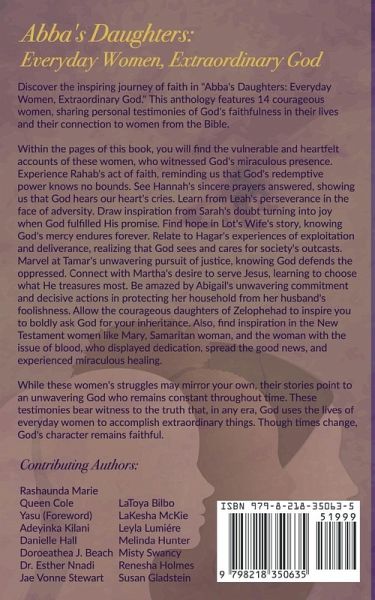 Abba's Daughters: Everyday Women, Extraordinary God Discover the inspiring journey of faith in "Abba's Daughters: Everyday Women, Extraordinary God." This anthology features 14 courageous women, sharing personal testimonies of God's faithfulness in their lives and their connection to women from the Bible. Within the pages of this book, you will find the vulnerable and heartfelt accounts of these women, who witnessed God's miraculous presence. Experience Rahab's act of faith, reminding us that God's redemptive power knows no bounds. See Hannah's sincere prayers answered, showing us that God hears our heart's cries. Learn from Leah's perseverance in the face of adversity. Draw inspiration from Sarah's doubt turning into joy when God fulfilled His promise. Find hope in Lot's Wife's story, knowing God's mercy endures forever. Relate to Hagar's experiences of exploitation and deliverance, realizing that God sees and cares for society's outcasts. Marvel at Tamar's unwavering pursuit of justice, knowing God defends the oppressed. Connect with Martha's desire to serve Jesus, learning to choose what He treasures most. Be amazed by Abigail's unwavering commitment and decisive actions in protecting her household from her husband's foolishness. Allow the courageous daughters of Zelophehad to inspire you to boldly ask God for your inheritance. Also, find inspiration in the New Testament women like Mary, Samaritan woman, and the woman with the issue of blood, who displayed dedication, spread the good news, and experienced miraculous healing. While these women's struggles may mirror your own, their stories point to an unwavering God who remains constant throughout time. These testimonies bear witness to the truth that, in any era, God uses the lives of everyday women to accomplish extraordinary things. Though times change, God's character remains faithful. Contributing Authors: Rashaunda Marie Queen Cole Yasu (Foreword) Adeyinka Kilani Danielle Hall Doroeathea J. Beach Dr. Esther Nnadi Jae Vonne Stewart LaToya Bilbo LaKesha McKie Leyla Lumie¿re Melinda Hunter Misty Swancy Renesha Holmes Susan Gladstein