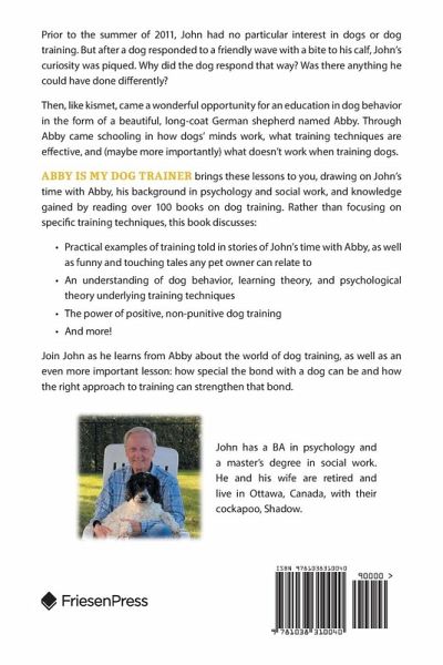 Prior to the summer of 2011, John had no particular interest in dogs or dog training. But after a dog responded to a friendly wave with a bite to his calf, John's curiosity was piqued. Why did the dog respond that way? Was there anything he could have done differently? Then, like kismet, came a wonderful opportunity for an education in dog behavior in the form of a beautiful, long-coat German shepherd named Abby. Through Abby came schooling in how dogs' minds work, what training techniques are effective, and (maybe more importantly) what doesn't work when training dogs. Abby is my Dog Trainer brings these lessons to you, drawing on John's time with Abby, his background in psychology and social work, and knowledge gained by reading over 100 books on dog training. Rather than focusing on specific training techniques, this book discusses: ¿ Practical examples of training told in stories of John's time with Abby, as well as funny and touching tales any pet owner can relate to ¿ An understanding of dog behavior, learning theory, and psychological theory underlying training techniques ¿ The power of positive, non-punitive dog training ¿ And more! Join John as he learns from Abby about the world of dog training, as well as an even more important lesson: how special the bond with a dog can be and how the right approach to training can strengthen that bond.