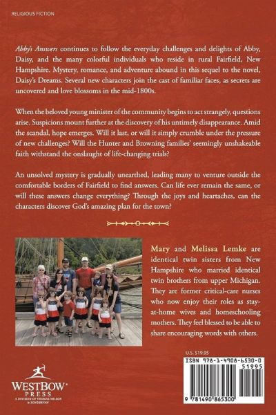 Abby's Answers continues to follow the everyday challenges and delights of Abby, Daisy, and the many colorful individuals who reside in rural Fairfield, New Hampshire. Mystery, romance, and adventure abound in this sequel to the novel, Daisy's Dreams. Several new characters join the cast of familiar faces, as secrets are uncovered and love blossoms in the mid-1800s. When the beloved young minister of the community begins to act strangely, questions arise. Suspicions mount further at the discovery of his untimely disappearance. Amid the scandal, hope emerges. Will it last, or will it simply crumble under the pressure of new challenges? Will the Hunter and Browning families' seemingly unshakeable faith withstand the onslaught of life-changing trials? An unsolved mystery is gradually unearthed, leading many to venture outside the comfortable borders of Fairfield to find answers. Can life ever remain the same, or will these answers change everything? Through the joys and heartaches, can the characters discover God's amazing plan for the town?