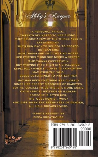 A personal attack and threats delivered to her phone... These are just a few horrors Abby is running from. She's run back to school to escape. But can she? Now, things are only getting worse. Her friends think she needs a keeper; she thinks differently, but proving it to them is a challenge. Especially when it comes to convincing Max Knightly, who seems determined to protect her. Max has been watching her closely since her recent diagnosis of diabetes. But he quickly finds there is more going on in Abby's life than just an illness. Someone is after her; the question is... Who? And just when she seems free of danger, all hell breaks loose!