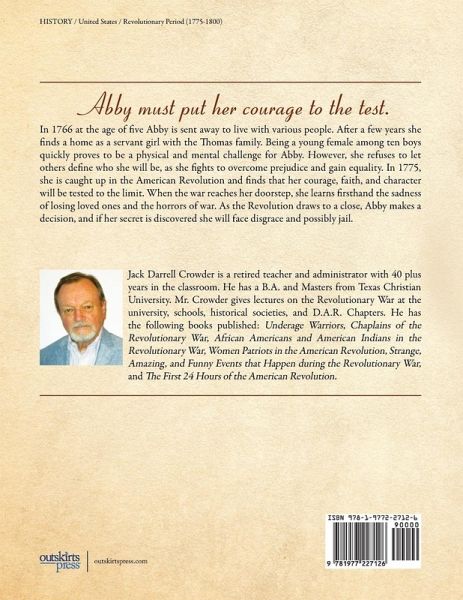 In 1766 at the age of five Abby is sent away to live with various people. After a few years she finds a home as a servant girl with the Thomas family. Being a young female among ten boys quickly proves to be a physical and mental challenge for Abby. However, she refuses to let others define who she will be, as she fights to overcome prejudice and gain equality. In 1775, she is caught up in the American Revolution and finds that her courage, faith, and character will be tested to the limit. When the war reaches her doorstep, she learns firsthand the sadness of losing loved ones and the horrors of war. As the Revolution draws to a close, Abby makes a decision, and if her secret is discovered she will face disgrace and possibly jail.
