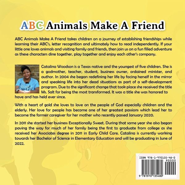 ABC Animals Make A Friend takes children on a journey of establishing friendships while learning their ABC's, letter recognition and ultimately how to read independently. If your little one loves animals and visiting family and friends, then join us on a fun filled adventure as these characters dine together, play together and enjoy each other's company.