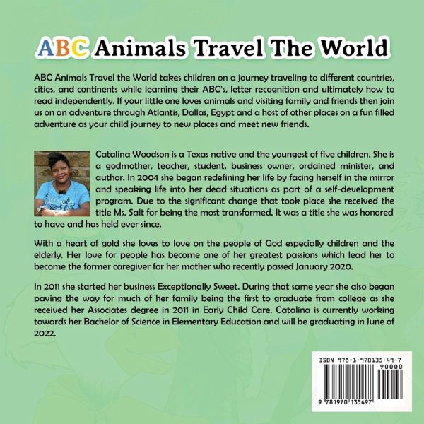 ABC Animals Travel the World takes children on a journey traveling to different countries, cities, and continents while learning their ABC's, letter recognition and ultimately how to read independently. If your little one loves animals and visiting family and friends then join us on an adventure through Atlantis, Dallas, Egypt and a host of other places on a fun filled adventure as your child journey to new places and meet new friends.