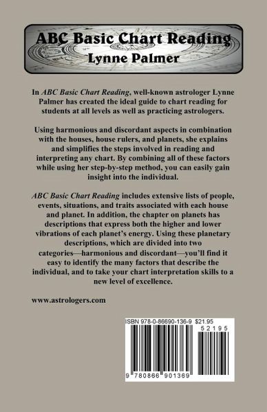 In ABC Basic Chart Reading, well-known astrologer Lynne Palmer has created the ideal guide to chart reading for students at all levels as well as practicing astrologers. Using harmonious and discordant aspects in combination with the houses, house rulers, and planets, she explains and simplifies the steps involved in reading and interpreting any chart. By combining all of these factors while using her step-by-step method, you can easily gain insight into the individual. ABC Basic Chart Reading includes extensive lists of people, events, situations, and traits associated with each house and planet. In addition, the chapter on planets has descriptions that express both the higher and lower vibrations of each planet's energy. Using these planetary descriptions, which are divided into two categories (harmonious and discordant), you'll find it easy to identify the many factors that describe the individual, and to take your chart interpretation skills to a new level of excellence.