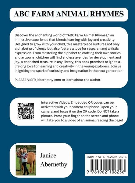 Discover the Farmyard Wonderland: With this charming book, your child will be transported to the heart of the farm, where they'll meet a delightful array of farm animals. From the gentle mooing of cows to the cheerful oinks of pigs, these sing-song rhymes will captivate your child's imagination, leaving them eager to explore the real farm world. Inspire a Lifelong Love of Learning: Our book is more than just rhymes. It's a key to unlocking a world of knowledge. As your child recites these engaging verses, they'll effortlessly learn the alphabet, intriguing facts about animals, and enriching vocabulary. They'll be introduced to the wonders of the animal kingdom while having a blast. Artistic Inspiration Awaits: Featuring original and captivating paintings of farm animals, this book is not only a reading adventure but also an artistic inspiration. The vivid illustrations will grab your little one's attention and might even encourage them to pick up their own paintbrush or colored pencils to create their farmyard masterpieces. A Treasure for Generations: "ABC Farm Animal Rhymes" is a book to cherish. Its educational value and timeless appeal make it a treasure that your child will want to read again and again. As they grow, they'll continue to appreciate the patterns and lessons within its pages, making it a beloved companion throughout their learning journey. Foster Creativity and Research: This book isn't just about reading; it's about sparking curiosity. Your child might be inspired to dive deeper into the world of farm animals, conducting their research or even crafting their rhyming tales. It's a springboard for creativity and exploration. Don't miss out on the opportunity to introduce your child to the joy of learning through the pages of "ABC Farm Animal Rhymes." Watch as they fall in love with farm animals, embrace the magic of the alphabet, and embark on a lifelong adventure of discovery. Order your copy today and let the farmyard adventure begin!