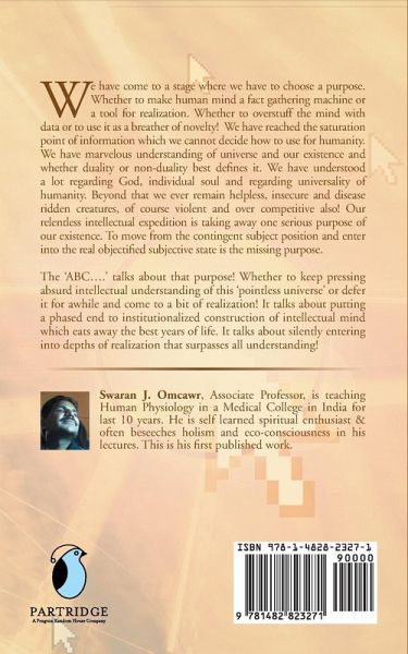 We have come to a stage where we have to choose a purpose. Whether to make human mind a fact gathering machine or a tool for realization. Whether to overstuff the mind with data and or to use it as a breather of novelty! We have reached the saturation point of information which we cannot decide how to use for humanity. We have marvelous understanding of universe and our existence and whether duality or non-duality best defines it. We have understood a lot regarding God, individual soul and regarding universality of humanity. Beyond that we ever remain helpless, insecure and disease ridden creatures, of course violent and over competitive too! Our relentless intellectual expedition is taking away one serious purpose of our existence. To move from the contingent subject position and enter into the real subjective awareness of both inner and outer world is the missing purpose. The 'ABC....' talks about that purpose! Whether to keep pressing absurd intellectual understanding of this 'pointless universe' or defer it for awhile and come to a bit of realization! It talks about putting phased end to institutionalized construction of intellectual mind which eats away the best years of life. It talks about silently entering into depths of realization that surpasses all understanding!