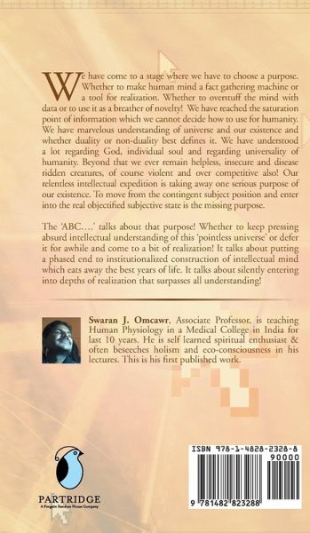 We have come to a stage where we have to choose a purpose. Whether to make human mind a fact gathering machine or a tool for realization. Whether to overstuff the mind with data and or to use it as a breather of novelty! We have reached the saturation point of information which we cannot decide how to use for humanity. We have marvelous understanding of universe and our existence and whether duality or non-duality best defines it. We have understood a lot regarding God, individual soul and regarding universality of humanity. Beyond that we ever remain helpless, insecure and disease ridden creatures, of course violent and over competitive too! Our relentless intellectual expedition is taking away one serious purpose of our existence. To move from the contingent subject position and enter into the real subjective awareness of both inner and outer world is the missing purpose. The 'ABC....' talks about that purpose! Whether to keep pressing absurd intellectual understanding of this 'pointless universe' or defer it for awhile and come to a bit of realization! It talks about putting phased end to institutionalized construction of intellectual mind which eats away the best years of life. It talks about silently entering into depths of realization that surpasses all understanding!