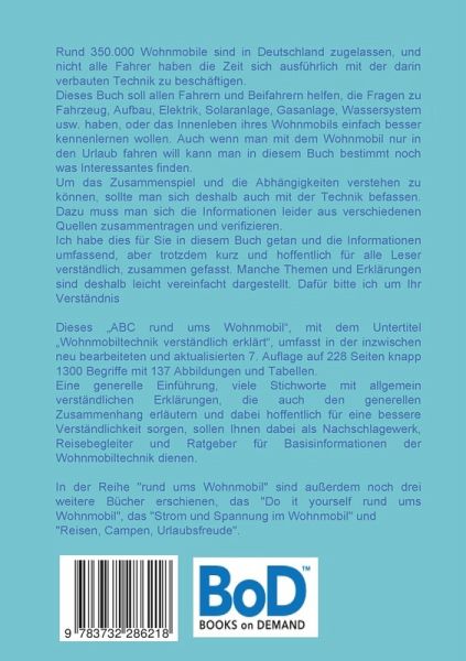 Rund 838.000 Reise- und Wohnmobile sind mit Stand Juli 2023 in Deutschland zugelassen und nicht alle Fahrer haben die Zeit, sich ausführlich mit der darin verbauten Technik zu beschäftigen und bestimmte Begriffe zu zuordnen.Dieses Buch soll allen Fahrern und Beifahrern dazu dienen aufkommende Fragen zu Fahrzeug, Aufbau, Gasanlage, Kühlschrank, Heizung und Wassersystem usw. zu beantworten. Auch wenn man damit nur in den Urlaub fahren will möchte man doch wissen was man da bedient und wie es grundsätzlich funktioniert. Um das Zusammenspiel und die Abhängigkeiten verstehen zu können sollte man sich auch mit der dahinter liegenden Technik befassen. Begriffe zu Stromversorgungen, Batterien, Solaranlagen und Ladegeräte oder Wechselrichter habe ich nur kurz erklärt. Mehr darüber und wesentlich ausführlicher erfahren Sie im Buch Strom und Spannung im Wohnmobil.Ich habe diese Informationen umfassend, aber hoffentlich trotzdem kurz genug und für alle Leser verständlich, zusammen gefasst. Manche Themen und Erklärungen sind deshalb leicht vereinfacht dargestellt. Dafür bitte ich um Ihr Verständnis.Hat man die grundsätzliche Technik, die Wirkungsweise und Zusammenhänge erst einmal verstanden kann man wesentlich gelöster und sicherer an auftretende Fragen oder Probleme herangehen und dem Händler besser formulierte Wünsche und Anforderungen übermitteln.Dieses ABC rund ums Wohnmobil, mit dem Untertitel Wohnmobiltechnik verständlich erklärt, umfasst in der inzwischen mehrmals aktualisierten 8. Auflage auf 196 Seiten, ca. 1485 Begriffe und 104 Abbildungen und Tabellen. In diesem Sinne, viel Spaß beim Lesen