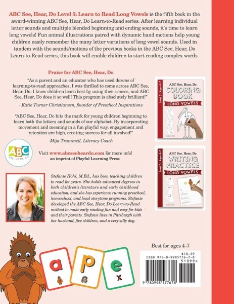 ABC See, Hear, Do Level 5: Learn to Read Long Vowels is the fifth book in the award-winning ABC See, Hear, Do Learn-to-Read series. Once children learn individual letter sounds and multiple blended beginning and ending sounds, it's time to learn letter combinations that create long vowel sounds. In this book, fun animal illustrations are paired with dynamic hand motions to help young children easily remember the long vowel sounds created by each letter combination. Designed with beginning readers in mind, this multisensory method of learning long vowels is simple, entertaining, and effective. Used in tandem with the sounds/motions of other books in the ABC See, Hear, Do Learn-to-Read series, this book will help children continue to build confidence reading. Best for ages 4-7. The ABC See, Hear, Do Learn-to-Read method combines visual, auditory, and kinesthetic learning styles to help increase phonemic awareness and promote deeper learning. Educational research consistently promotes teaching methods which integrate multiple learning modalities, thereby resulting in increased understanding and retention. Incorporating movement into learning encourages brain development and increased cognition. The ABC See, Hear, Do Learn-to-Read method links engaging illustrations with simple text and dynamic hand motions, promoting long-lasting comprehension and simple fun while learning. Great for homeschoolers, teachers, speech language pathologists, and parents, ABC See, Hear, Do offers a multitude of simple, effective learn-to-read resources that introduce children to the joy of reading.