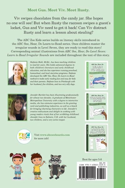 Meet Gus. Meet Viv. Meet Rusty. Viv swipes chocolates from the candy jar. She hopes no one will see! But when Rusty the raccoon swipes a guest's locket, Gus and Viv need to get it back! Can Viv distract Rusty and learn a lesson about stealing? The ABC Zoo Kids series builds on literacy skills introduced in the ABC See, Hear, Do Learn-to-Read series. Once children master the irregular sounds in Level Seven, they are ready to read this story! Corresponding animal illustrations from ABC See, Hear, Do Level Seven: Learn to Read Irregular Sounds are included throughout the text of this story.