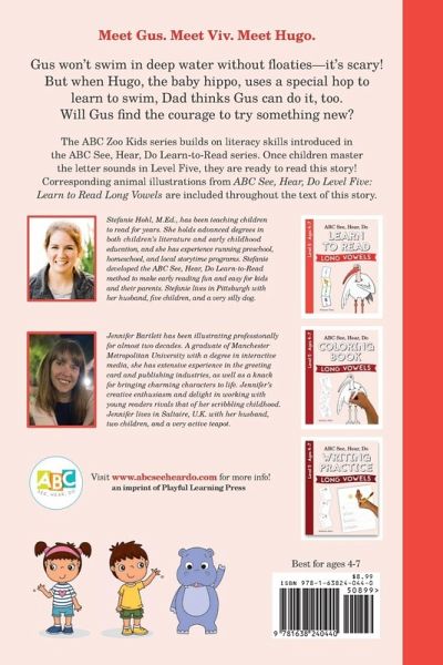 Gus won't swim in deep water without floaties-it's scary! But when Hugo, the baby hippo, uses a special hop to learn to swim, Dad thinks Gus can do it, too. Will Gus find the courage to try something new? The ABC Zoo Kids series builds on literacy skills introduced in the ABC See, Hear, Do Learn-to-Read series. Once children master the letter sounds in Level Five, they are ready to read this story! Corresponding animal illustrations from ABC See, Hear, Do Level Five: Learn to Read Long Vowels are included throughout the text of this story.