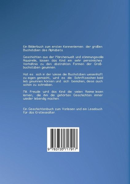 Ein Bilderbuch zum ersten Kennenlernen der großen Buchstaben des Alphabets.Geschichten aus der Märchenwelt und stimmungsvolle Aquarelle, lassen das Kind ein sehr persönliches Verhältnis zu den abstrakten Formen der Großbuchstaben gewinnen.Hat es sich in der Weise die Buchstaben wesenhaft zu eigen gemacht, wird es die Schriftzeichen bald lieb gewinnen können und sich bemühen, diese auch schön zu schreiben.Mit Freude wird das Kind die vielen Reime lesen lernen, die ihm die gehörten Geschichten immer wieder lebendig machen.Ein Bilderbuch zur Einführung der Großbuchstaben. Ein Geschichtenbuch zum Vorlesen und ein Lesebuch für das Erstlesealter. Taschenbuchausgabe