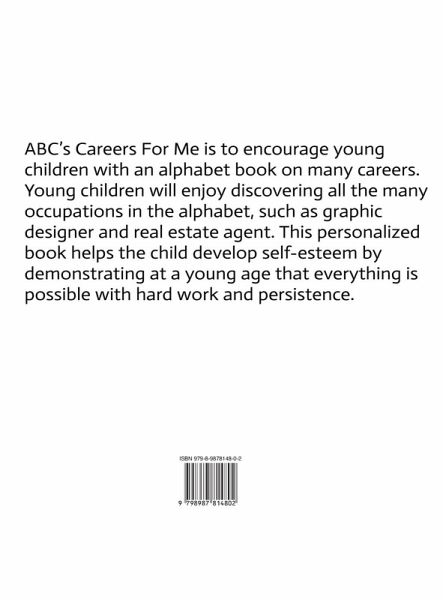 ABC's Careers for me is to encourage young children with an alphabet book on many careers. Young children will enjoy discovering all the many occupations in the alphabet, such as graphic designer and real estate agent. This personalized book helps the child develop self-esteem by demonstrating to him or her at a young age that everything is possible with hard work and persistence.